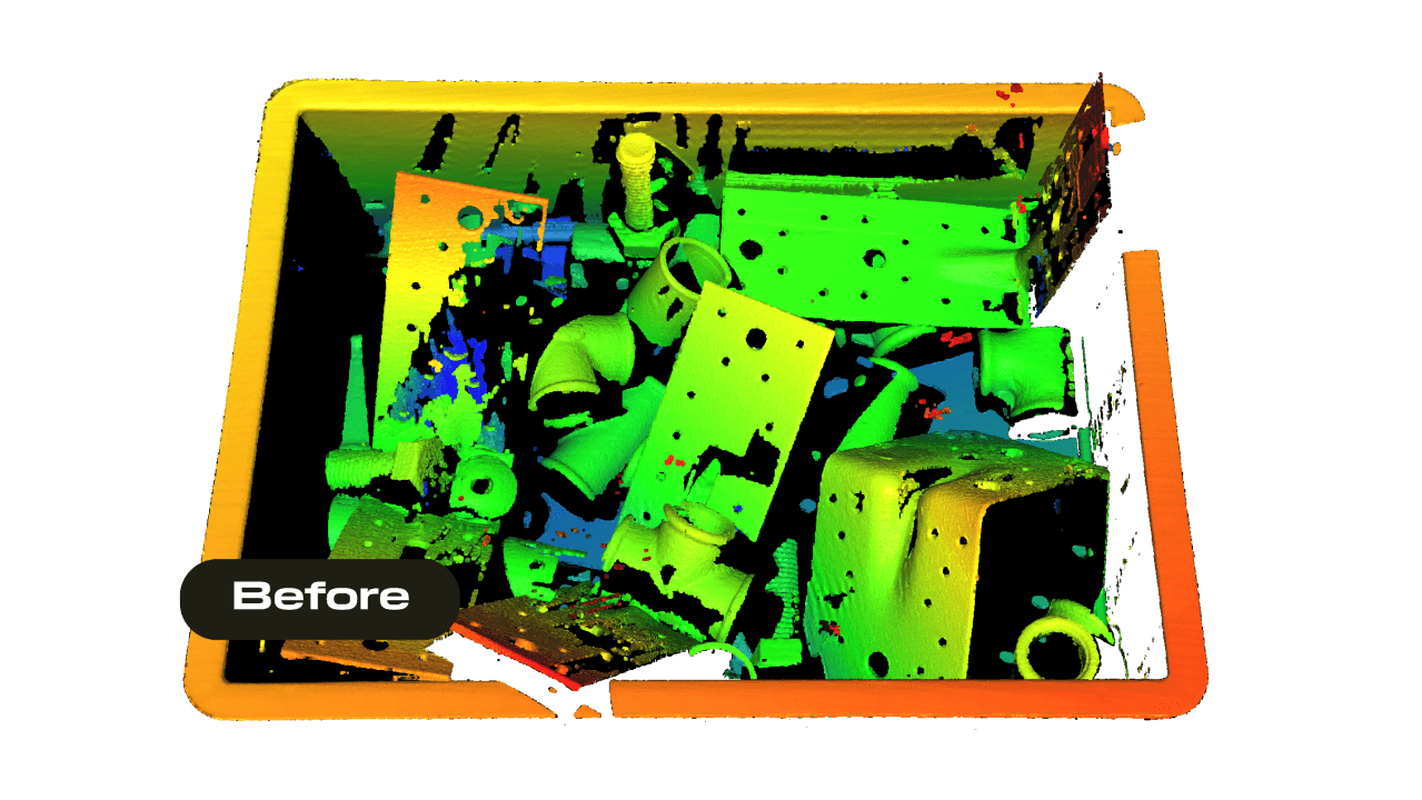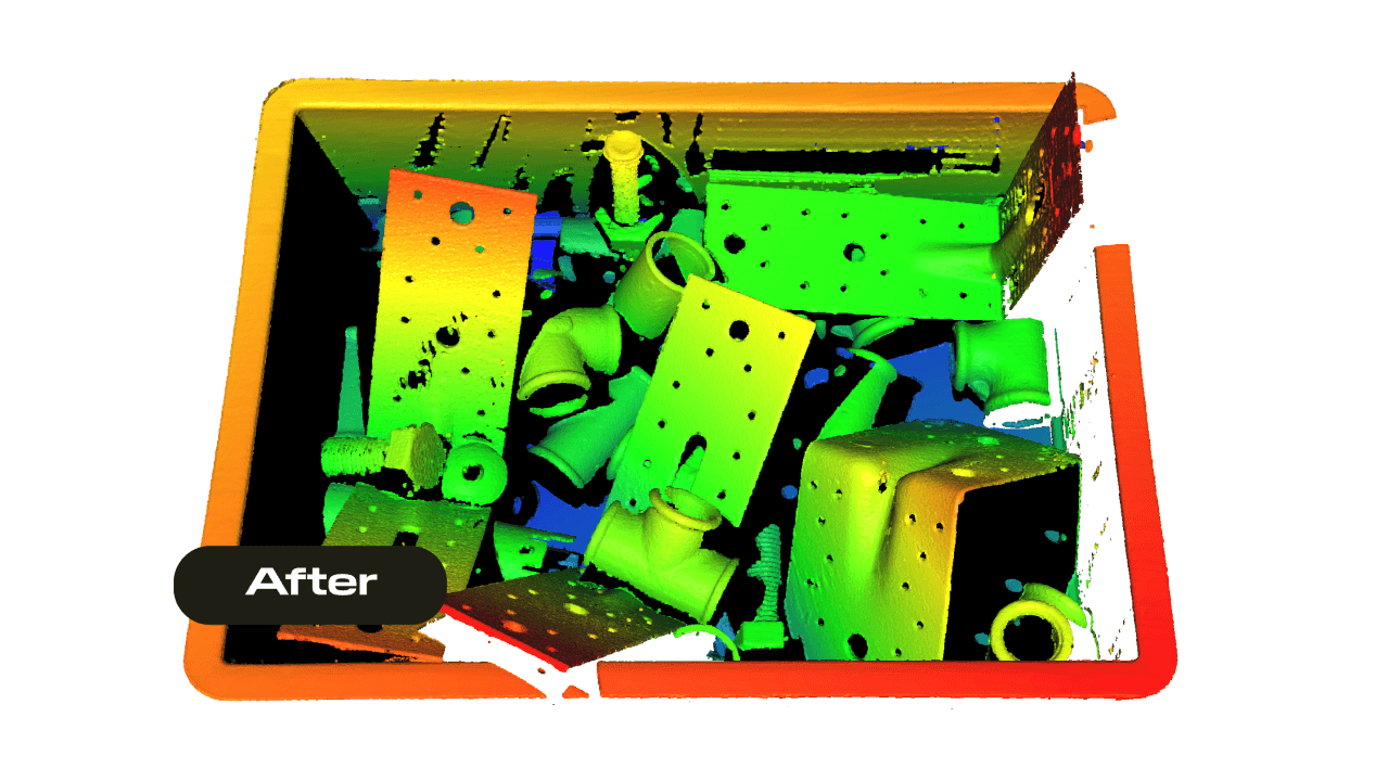 Boost 3D data completeness for demanding tasks like bin picking, delayering, and digital twin creation. MultiView overcomes challenges with thin, reflective, or irregular parts, ensuring better grasp points, faster cycle times, and higher robotic success rates.